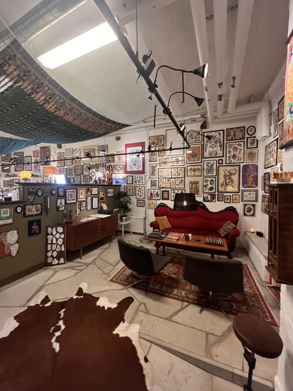 Lokalerna ligger i källaren en trappa ner från gatan. De ljusa och rymliga, inredda med second-hand möbler samt med mängder av tatueringsmotiv på väggarna.