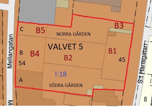 Situationsplan kv Valvet 5, S:t Hansgatan 45 och Mellangatan 54A-C. Tidigare fastighetsbeteckning S:t Hansroten I:18.