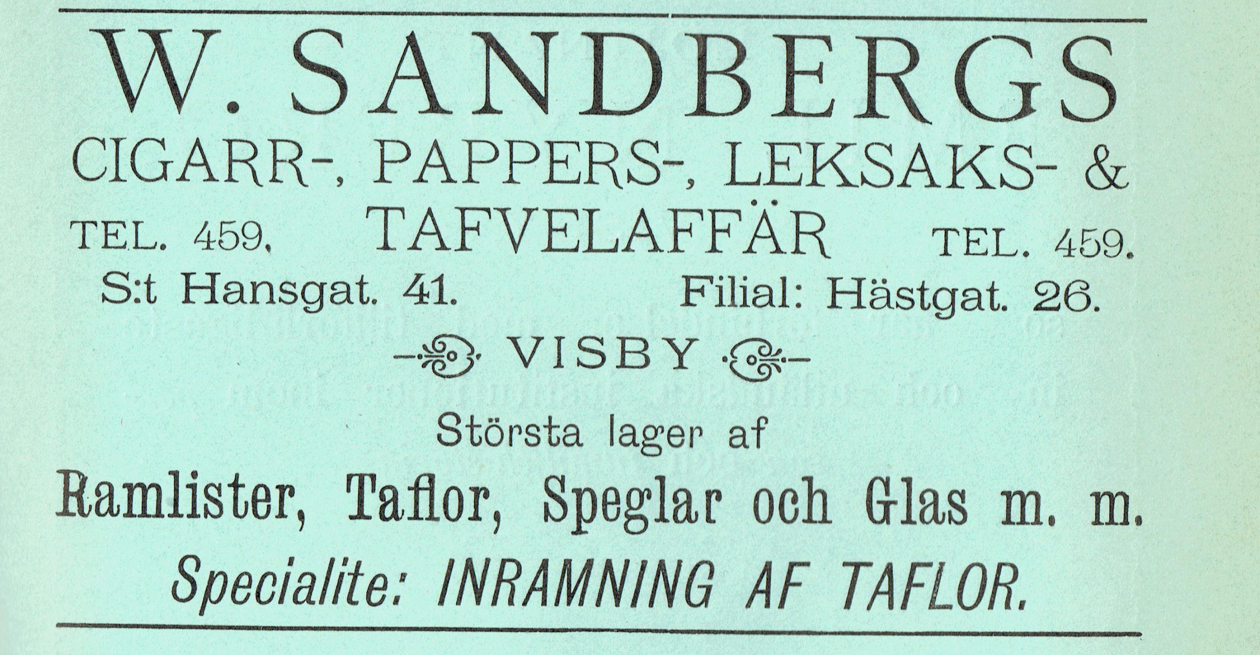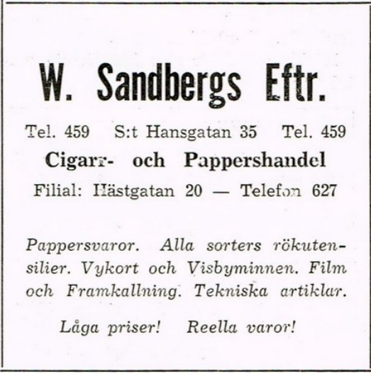 | Sandberg Pappers- o Cigarrhandel | 1910 – 1942 | Werner, Josefina och Verna Sandberg | Från S:ta Katarinagatan 3, filialer Adelsgatan 12 och Hästgatan 26 |