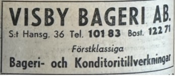 Visby Bageri bedrev bageriverksamhet vid S:t Hansgatan 36 under 1950-talet. Okänt är i vilken lokal som bageriet fanns, möjligen i lokalen under valvet?