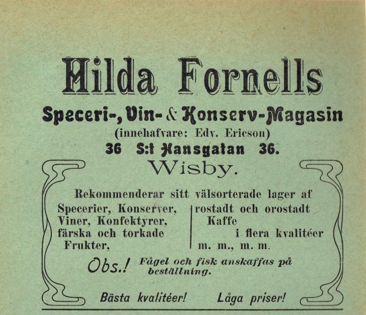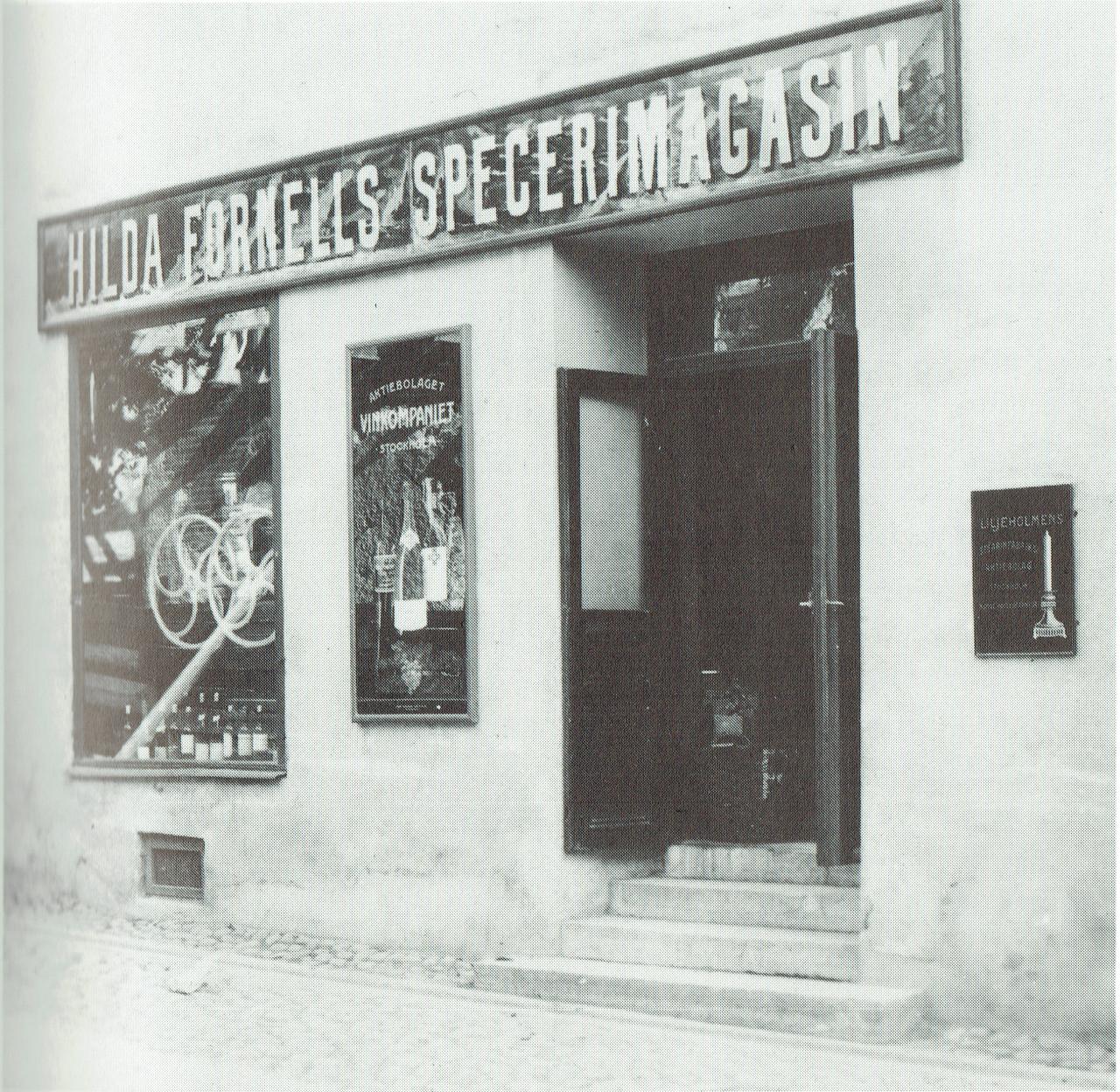 Omkring år 1906 öppnade Hilda Fornell en speceriaffär som hon kallade Hilda Fornells Specerimagasin. Hon sålde bland annat också vin. Hon hade en tavla till vänster om entrédörren med reklam för viner. Här hade sedan slutet av 1800-talet funnits bageri till Hilda tog över lokalerna. Innehavaren av affären J Edv Eriksson drev den fram till omkring 1930, då den togs över av Edvin Krohn.