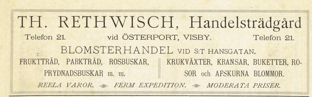 | Th Rethwisch Blomsterhandel | 1900 – 1930 | Theodor Retwisch | Läge S:t Hansgatan 36 |