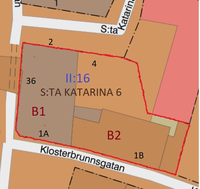 Fastigheten S:ta Katarina 6 omfattar två byggnader. Huvudbyggnaden (B1) ligger utmed S:t Hansgatan med adressen S:t Hansgatan 36 som huvudadress. Byggnaden B2 ligger utmed Klosterbrunnsgatan med adressen Klosterbrunnsgatan 1B och uppfördes som en Brygghusflygel till huvudbyggnaden.