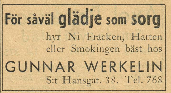 Gunnar Wilhelm Edvin Werkelin kom från Fårösund och började sin bana som skräddare. År 1940 uppförde han en stor modern fastighet i Fårösund och inredde den till herrekipering och skrädderi. Samma år öppnade han ett skrädderi i Visby vid S:t Hansgatan 38 och han startade också där en militärekiperingsaffär. År 1942 öppnade Werkelin en tvätt- och pressanläggning vid S:t Hansgatan 36, dit han samtidig flyttade ekiperingsaffären. Skrädderiet fanns kvar vid S:t Hansgatan 38 till omkring 1950. Läs mer om Gunnar Werkelins verksamhet under S:t Hansgatan 36.