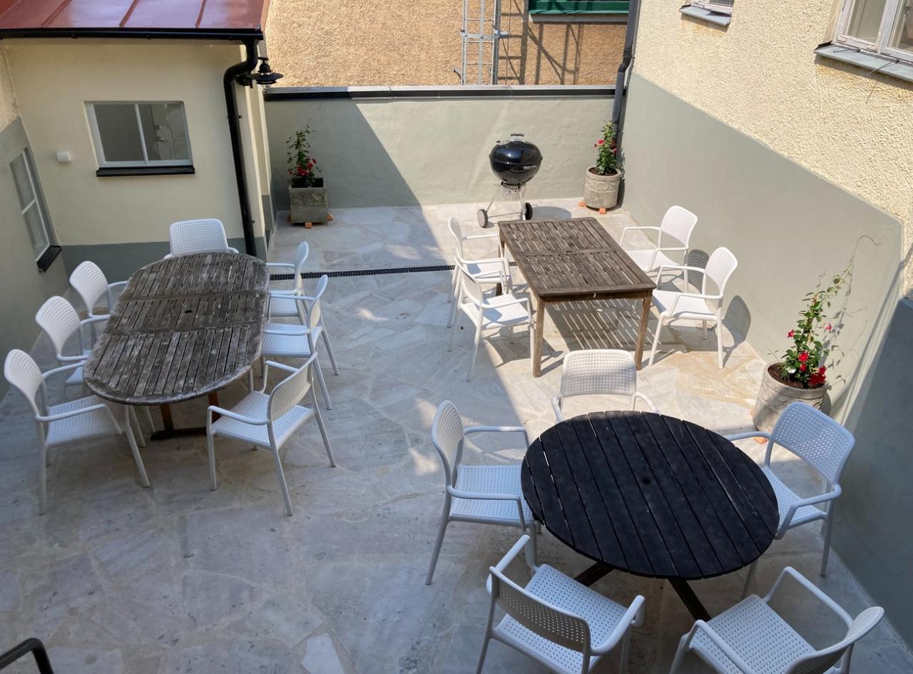 Fastigheten kv Muggen 2 rymmer en liten gård omgiven av byggnader och en mur i väster. Gården var tidigare stenlagd utan växtlighet. Idag ingår den som uteplats för lägenhetshotellets gäster.