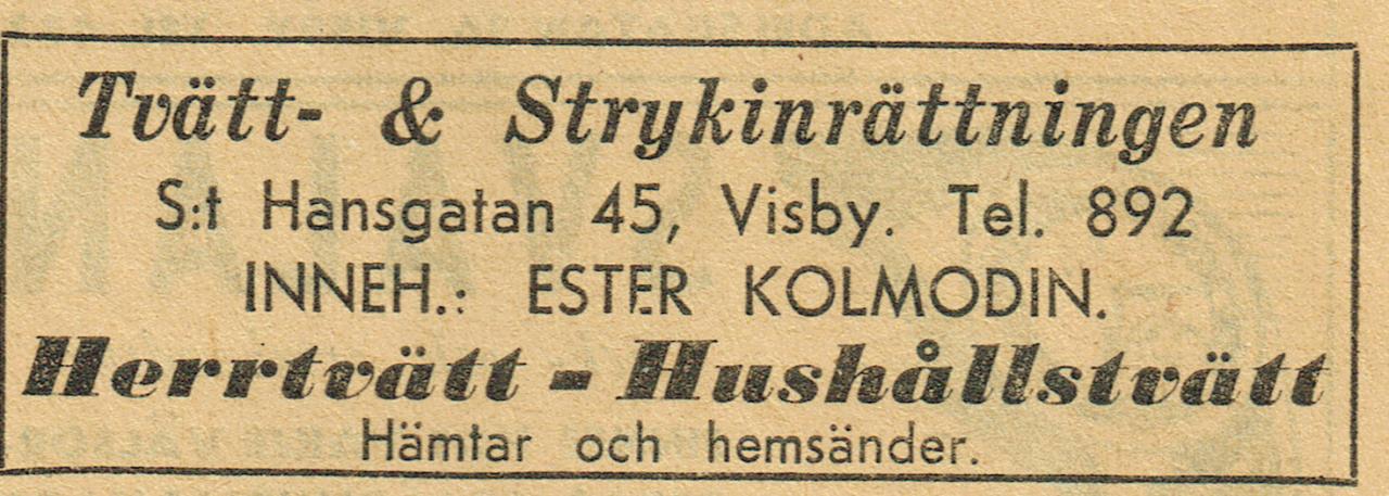 Ester Kolmodin drev sitt företag Tvätt- och Strykinrättningen c:a åren 1940 – 1950 vid S:t Hansgatan 45.