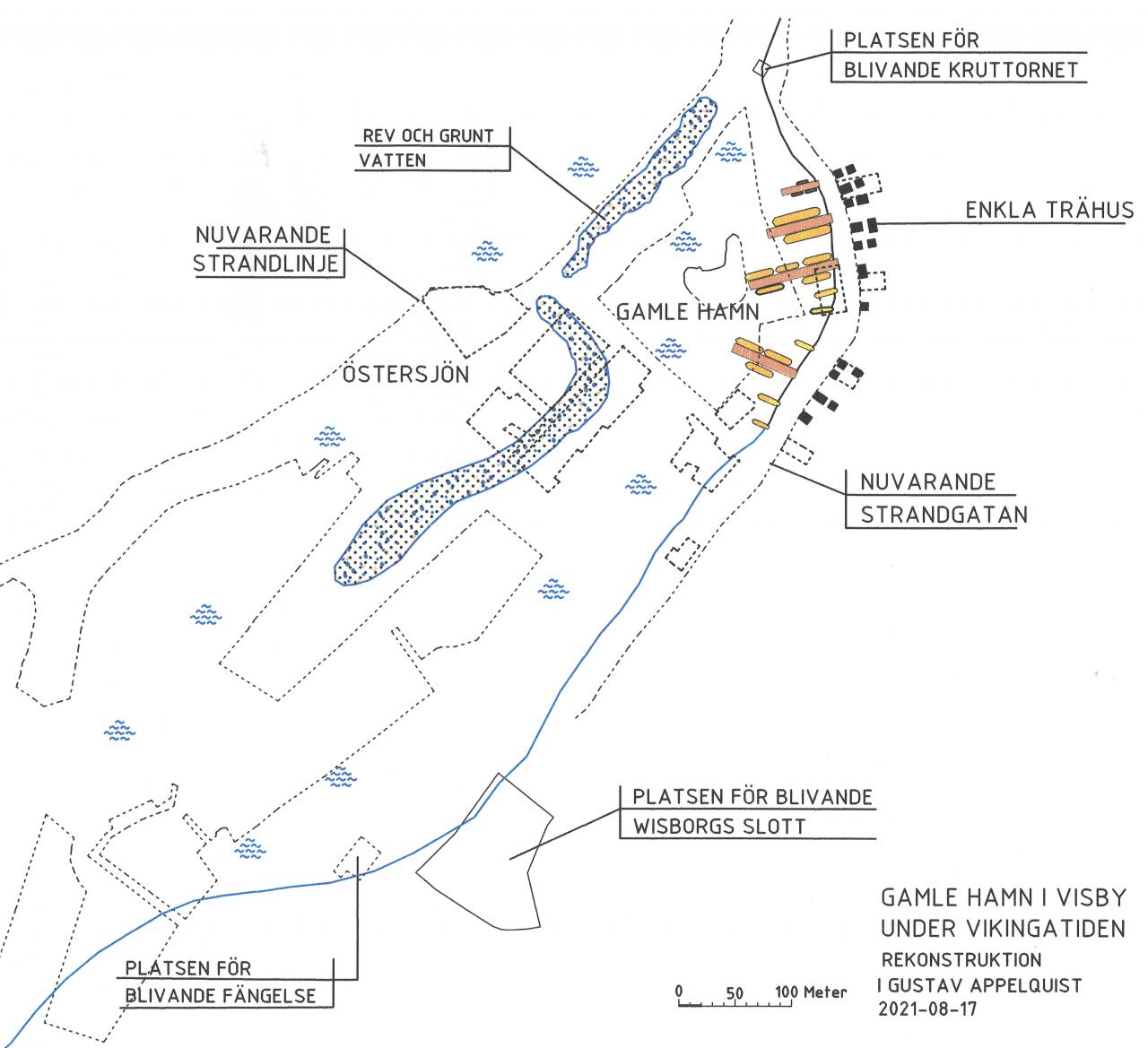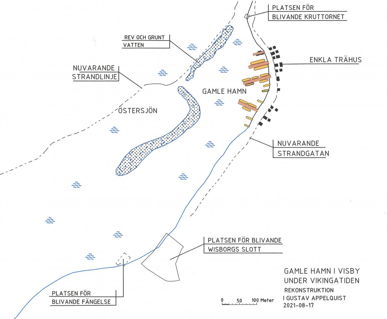 Att platsen för nuvarande Almedalen kom att bli en viktig hamn under vikingatid och framför allt under medeltiden berodde på att det fanns en skyddad plats bakom ett grusrev som bildats av vågorna i havet. Hamnen var då en lagun och med relativt lugnt vatten som gav skydd för båtarna mot havets vågor. En bra hamn för dåtidens skepp. Grusrevets utbredning var av stor betydelse för hamnens förändring, därför redovisas det på kartorna nedan på ett markerat sätt. Genom den hela tiden pågående landhöjningen, omkring 2,5 mm per år, växte storleken på grusrevet och hamnen blev allt grundare år från år. Följ nedan hur Gamle hamn antas förändras baserad på nutida topografi, historiska kartor, gamla bilder och beskrivningar. Eftersom utvecklingen av den intilliggande bebyggelsen på Strandgatan varit så nära förknippat med Gamle hamn och Almedalen redovisas också dessa byggnader översiktligt. Gator och byggnader är angivna med namn som anknyter till aktuell tidsperiod, där så har varit möjligt.