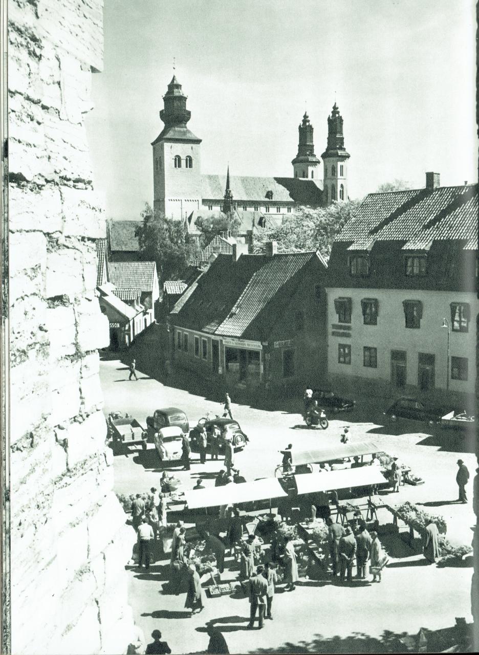 Stånden med sina segeldukstak, landsborna med sina vagnar, alla handlande fruar, som nästan alltid var stamkunder vid något av stånden. På södra sidan stod godisstånden, sedan kom kött- och fiskstånden. Där fanns också den viktiga vågboden, där landsborna vägde upp och försålde hela djurkroppar. I ett stånd sålde man bröd – stora goda Gotlandslimpor – och i ett annat kläder. Det var på den tiden, man kunde köpa ett stort bomullsförkläde för en krona och ”lysdukar” för 50 öre styck. Ungefär mitt i torgets centrum hade Hilma Magnusson sitt fiskstånd vaktat av en stor Sankt Bernhardshund. Naturligtvis fanns det också blommor och grönsaker och produkter från D.B.W.s handelsträdgård. På norra sidan höll bönderna med sina fjädervagnar. Där kunde man köpa ägg, rosenpotatis och fin Skälsöströmming, ibland också ett kokhöns eller en tupp.